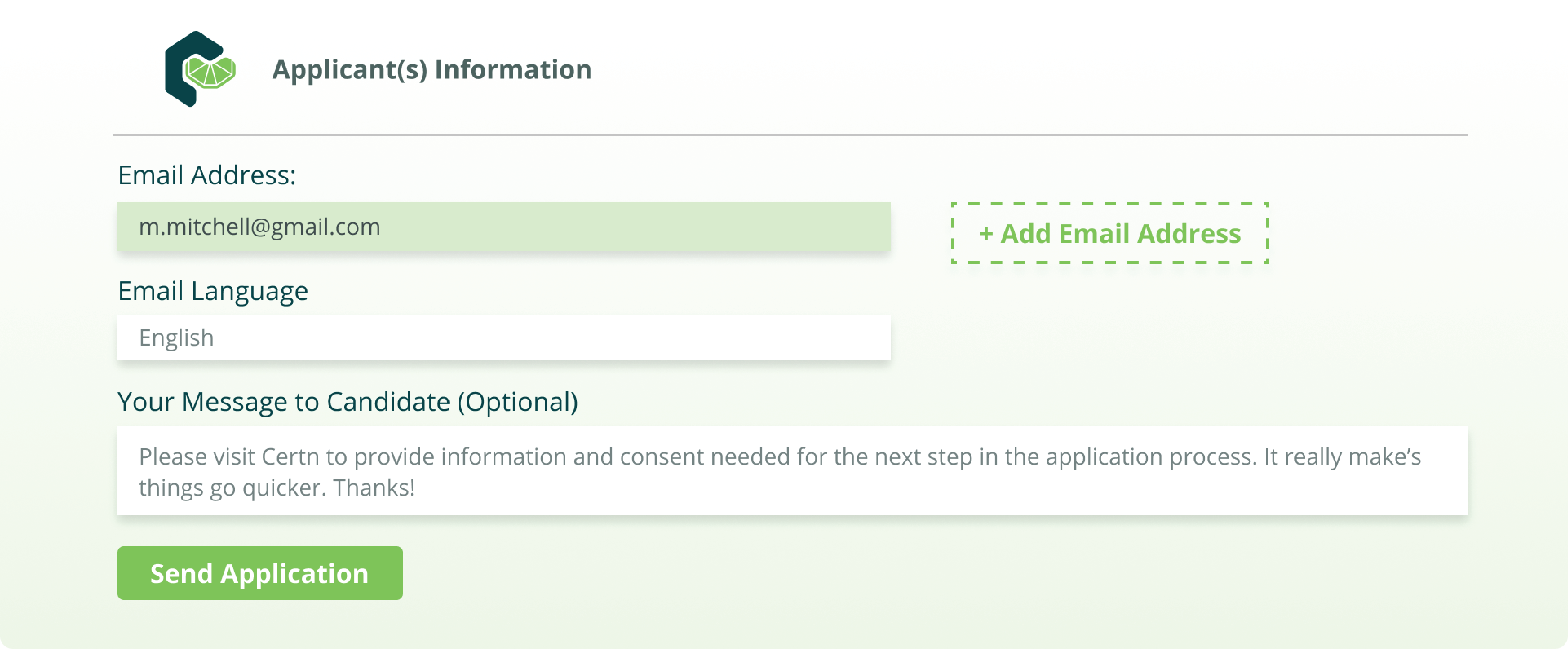 Email an application to your candidate directly from the Certn Lime platform. You can track your candidate’s progress in your dashboard